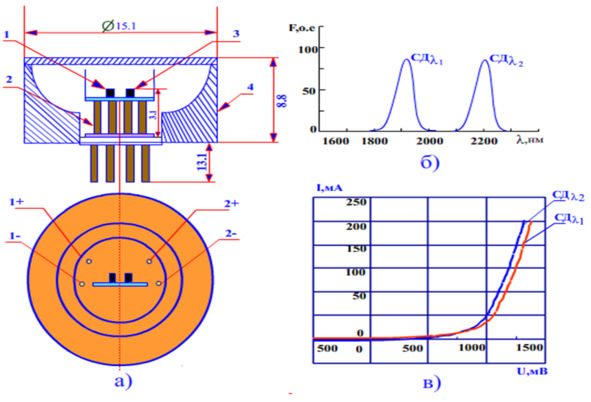 Fig. 3. LED with a parabolic reflector: a) design, b) radiation spectra, c) VAC (where: 1 – LED chip (1.94 microns), 2 – thermal cooler, 3 – LED chip (2.2 microns), 4 – parabolic reflector)