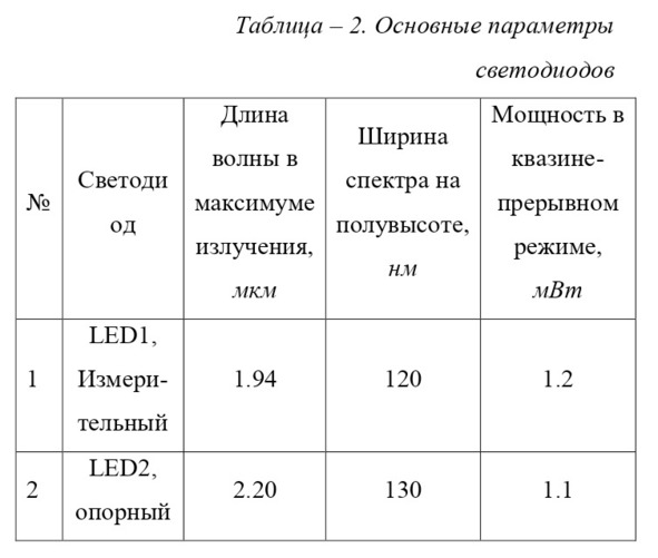 LEDs based on the GaAlAsSb/GaInAsSb/ GaAlAsSb double heterostructure had a quantum yield of 5.8%, a radiation wavelength of 1.94 microns for measuring the moisture content of raw cotton, its main parameters are shown in Table 2.