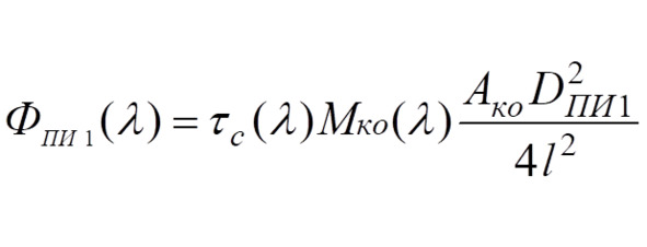 where: tc (λ) is the spectral transmittance of the atmosphere; Mco (λ) is the spectral density of the energy luminosity radiating from the surface of the controlled object; Ako is the area of the radiating surface of the controlled object; DP1 is the diameter of the entrance pupil of the first radiation receiver; l is the distance between the controlled object and the first photodetector.