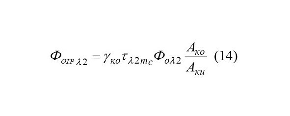 where Aki is the cross – sectional area of collimated radiation; τλ2mc is the transmittance of the atmosphere at wavelengths λ2m; Foλ2 is the initial flux of collimated radiation. In this case, the reflected flow from the surface of the controlled object 1 is defined as: