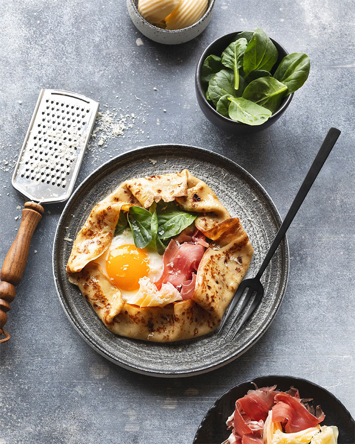 В центр каждого крепа выложите листья шпината, яичницу из одного яйца, ломтик ветчины и подверните края крепа в центр, формируя галету. Покрошите или положите в каждую креп-галету кусочек пикантного сыра Тет де Муан и наслаждайтесь вкусом истинно французского завтрака!