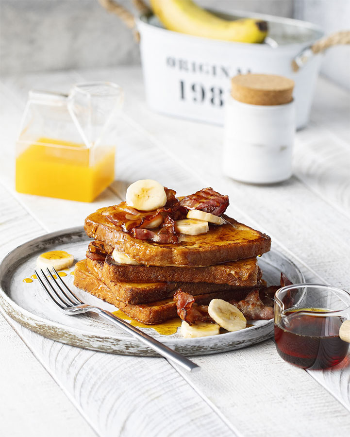 На каждый тост выложите колечки банана, хрустящий бекон, полейте тост кленовым сиропом и наслаждайтесь фееричным завтраком!