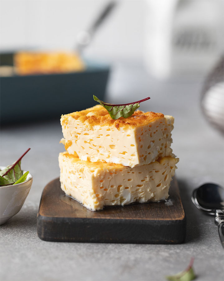 Форму для выпекания смажьте сливочным маслом и вылейте в нее яично-молочную смесь практически до самых краев. Выпекайте омлет 30–35 минут до легкой золотистой шапочки.