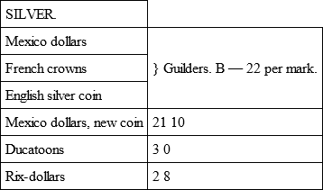 Bar silver, containing 11-12ths fine silver, 21 per mark, and in this proportion down to 1-4th fine, on which 5 guilders are given.