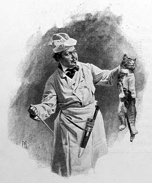 Гарун бежал быстрее лани,Быстрей, чем заяц от орла;Бежал он в страхе с поля брани,Где кровь черкесская текла[123].Особняком по богатству анималистических мотивов в русской литературе стоит проза Н. В. Гоголя, искушающая к тому, чтобы искать – и, конечно, находить – в его сочинениях аллегории разной степени назидательности или (что кажется мне более верным) примеры языковой игры и жанровой травестии. В ряду таких примеров не обойдены и зайцы – помимо упоминаний об охоте на них, которая предстает у Гоголя чем-то вроде национально-самобытной страсти и вместе с тем времяпрепровождением, характерным для досужих дармоедов. В «Ревизоре» травля зайцев – любимое занятие судьи и городничего. В «Коляске» о такой охоте пекутся окружные помещики. В «Повести о том, как поссорился Иван Иванович с Иваном Никифоровичем» (1835) первый из поименованных истцов сам ведет себя как заяц, когда спешит подать жалобу на своего недруга в миргородский суд. В «Мертвых душах» – поэме, как отмечалось уже ее первыми интерпретаторами, создающей местами впечатление намеренного анималистического ребуса – сцена разговора двух приятных дам, гадающих о тайном намерении Чичикова, вызывает образ русского барина, устремляющегося в конную погоню за зайцем. Ноздрев, показывающий Чичикову свое поместье, уверяет его в том, что «вот на этом поле <…> русаков такая гибель, что земли не видно», и что он «сам своими руками поймал одного за задние ноги» («„Ну, русака ты не поймаешь рукою!“ – заметил зять. „А вот же поймал, нарочно поймал!“ – отвечал Ноздрев»). Хлебосол Собакевич рисует перед Чичиковым устрашающую картину губернаторской кулинарии: «Ведь я знаю, что они на рынке покупают. Купит вон тот каналья повар, что выучился у француза, кота, обдерет его, да и подает на стол вместо зайца». (В юбилейном издании А. Ф. Маркса (СПб., 1901 года) восклицание Собакевича дополнено иллюстрацией художника Мечислава Михайловича Далькевича, на которой изображен зловещего вида повар, одной рукой держащий на весу за шкирку кота, а другой сжимающий здоровенный нож.)
