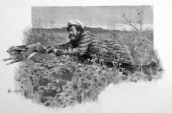 Зная, что гонные зайцы выбирают в лесу дорожки и чистые поляны, на которых могут, прибавив бегу, успешнее уйти от набегающей стаи, я остановился на продолговатой поляне, вдоль прорезаемой лесною дорогою <…> Долго стоял я, прислушиваясь к отдаленному гону; но вот лай все громче и видимо приближается; я весь превратился в слух и через минуту увидал зайца <…> Подпустивши его на довольно близкое расстояние, я выстрелил, и заяц покатился через голову, взмахнув, очевидно, перебитою заднею ногою. Не успел я броситься к своей добыче, как заяц кинулся бежать прямо на меня; я приложился, чтобы добить его из левого ствола, но левый ствол дал осечку. Я решился прижать ружьем зайца к земле <…> но и тут я промахнулся. <…> В жару неудачной гимнастики я не заметил, что стая гончих с яростным лаем обскакала меня и шагах в пятнадцати по дороге от меня схватила закричавшего зайца. Зная, что через минуту от моего зайца не останется ни клочка, я <…> вырвал зайца у них из зубов; но если бы при этом я решился опустить зайца ниже своей головы, то никакие крики не помогли бы <…> Чтобы не держать в руках изувеченного зайца, я со словами «приколи его» передал зайца Жгуну (денщику, помогавшему на охоте. – К. Б.). Тот хладнокровно, доставши из голенища большой складной ножик, прямо отпазаничал зайца, т. е. отрезал ему по коленный сустав ноги.