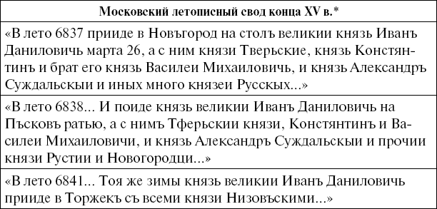 Московский книжник в конце XV в. выделяет совместные действия Ивана Калиты и князей Северо-Восточной Руси (в том числе тверских и суздальских) и, соответственно, главенствующее положение среди них московского князя (табл. 4). Это подчеркнуто в сообщениях, посвященных военным походам. Летописец делает акцент на участии в этих походах других русских князей, что придает им статус общерусских, а московский князь Иван предстает лидером всей Северо-Восточной Руси.