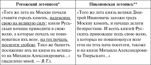 Как уже было сказано ранее, краеугольным камнем идеологической политики являлась концепция великого княжения Владимирского как наследственного владения, отчины московских князей со времен Ивана Даниловича Калиты. Так, при описании борьбы Дмитрия Московского и Дмитрия Суздальского термины «отчина», «стол отца и деда», «отчина дедина» употребляются (в отношении занятия Владимира Дмитрием Московским) между 1359 и 1363 гг. в Рогожском летописце четыре раза[372] в год, в Симеоновском, Никоновском и Московском летописном своде конца XV в. – три раза[373]. Что характерно, использование московскими книжниками данных терминов мы встречаем также применительно к восшествию на великокняжеский престол сына Дмитрия Донского – Василия I. Московский летописный свод конца XV в. сообщает, что «седе на великом княженье во Володимери князь Василеи Дмитреевич на столе отца своего, деда и прадеда…» (выделено мной. – В.Т.)[374]. Аналогичную формулировку находим и в Никоновской летописи[375].