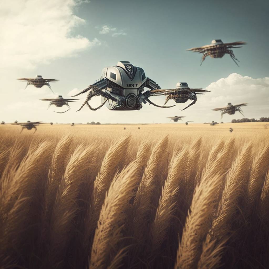 Рисунок 2. Рой роботов исследуют поле пшеницы. Сгенерировано с помощью Midjourney.
