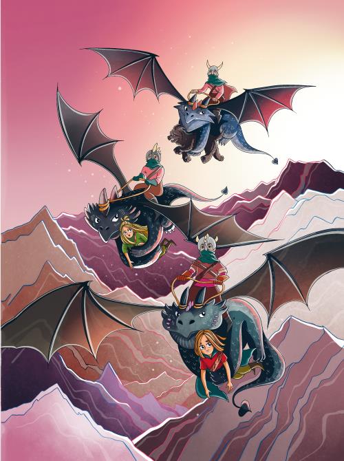 Тут Барбос зарычал. Девочки услышали шум и увидели, что с небес опускаются три огромные птицы. Они спускались всё ниже и ниже, и тут сёстры к своему ужасу поняли, что это не птицы, а самые настоящие драконы, на которых сидели всадники. Это были слуги Злой королевы, ведь каменная принцесса находилась в её владениях.