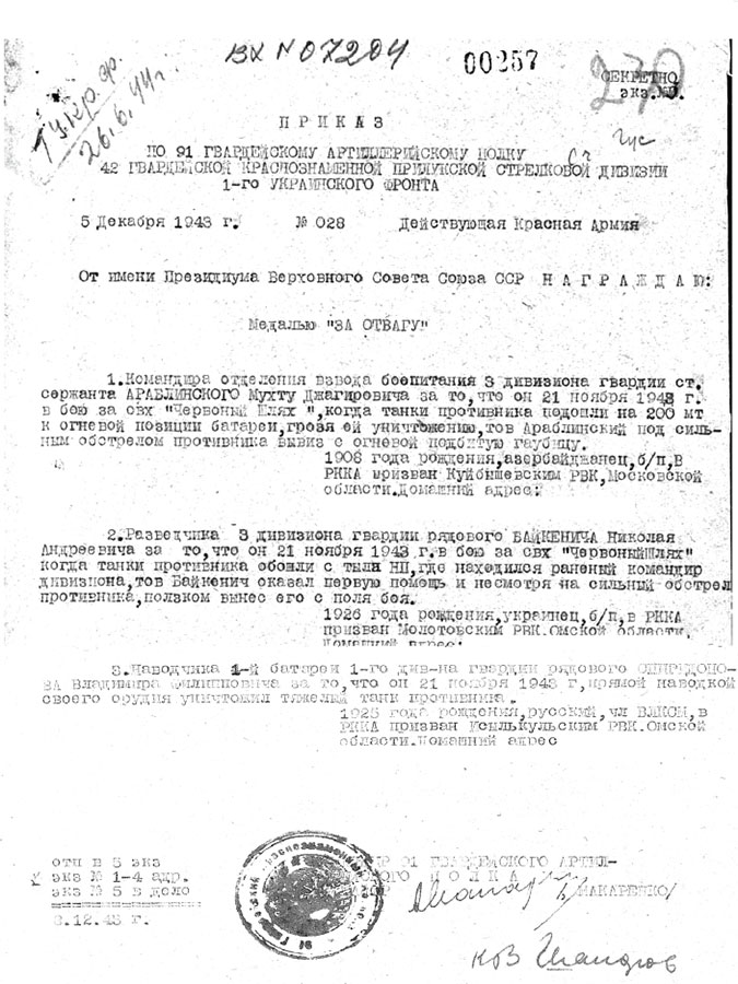 Приказ № 028 от 5 декабря 1943 г. по 91-му Артиллерийскому полку 42-й дивизии 1-го Украинского фронта о награждении ст. сержанта Араблинского Мухтара Джангировича, 1908 г. рожд., азербайджанца, беспартийный, призванный Куйбышевским РВК г. Москвы