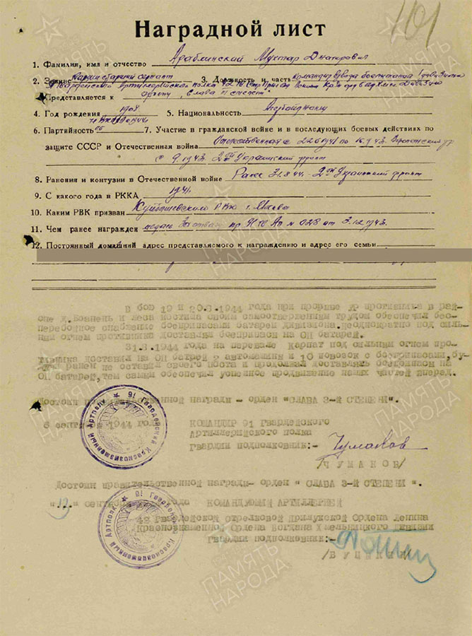 Наградной лист о представлении к правительственной награде – ордену Славы III степени ст. сержанта Араблинского Мухтара Джангировича, 1908 г. рожд., азербайджанца, призванного Куйбышевским РВК г. Москвы. 22 сентября 1944 г.