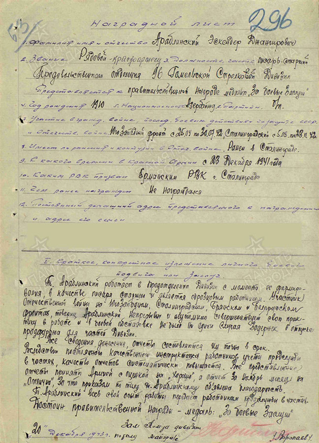 Наградной лист от 20 декабря 1943 г. о представлении к медали «За боевые заслуги» Эскендера Джангировича Араблинского, рядового, 1910 г. рожд., азербайджанца, б/п, призванного Ермакским РВК г. Сталинграда Наградной лист о представлении к ордену Красной Звезды