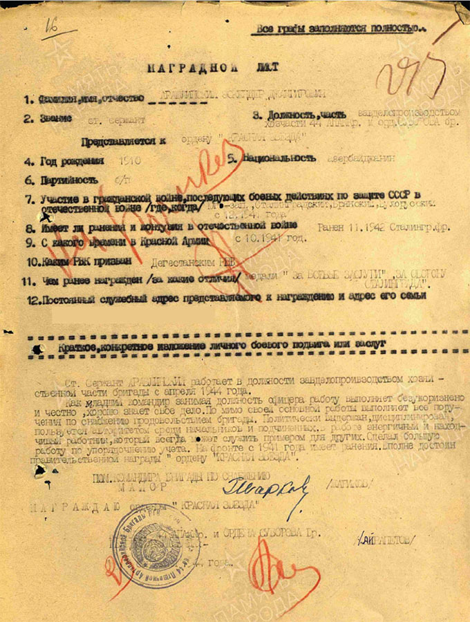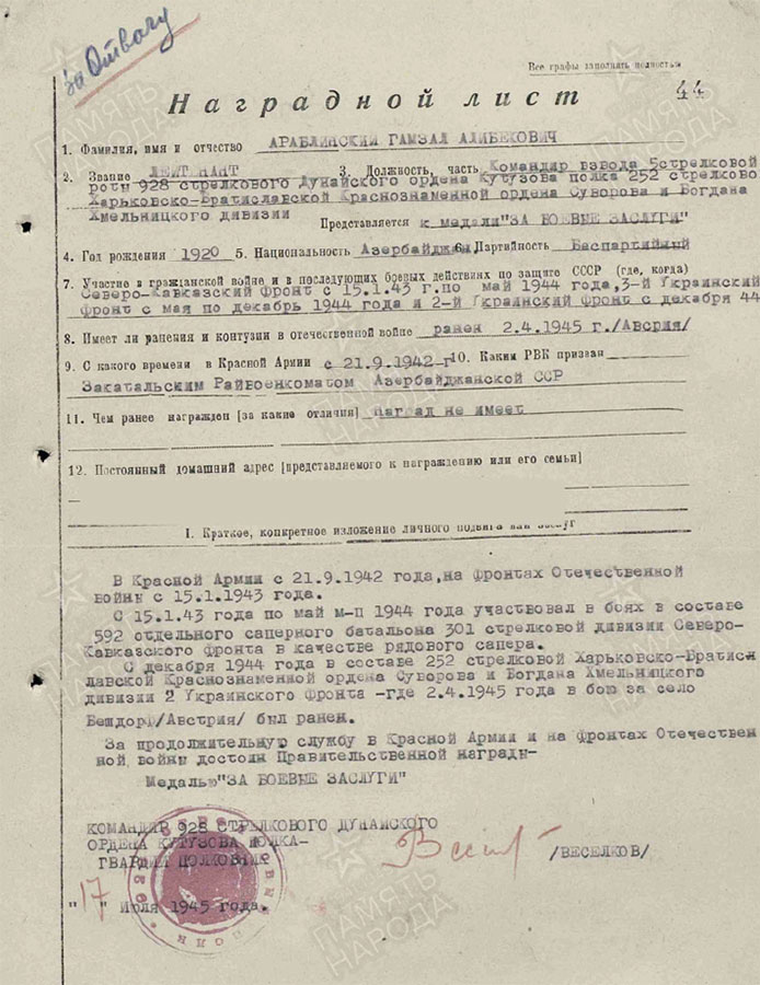 Наградной лист о представлении командира стрелкового взвода лейтенанта Араблинского Гамзало́ва Алибековича, азербайджанца, 1920 г. рожд., уроженца с. Тала-2, к медали «За боевые заслуги»