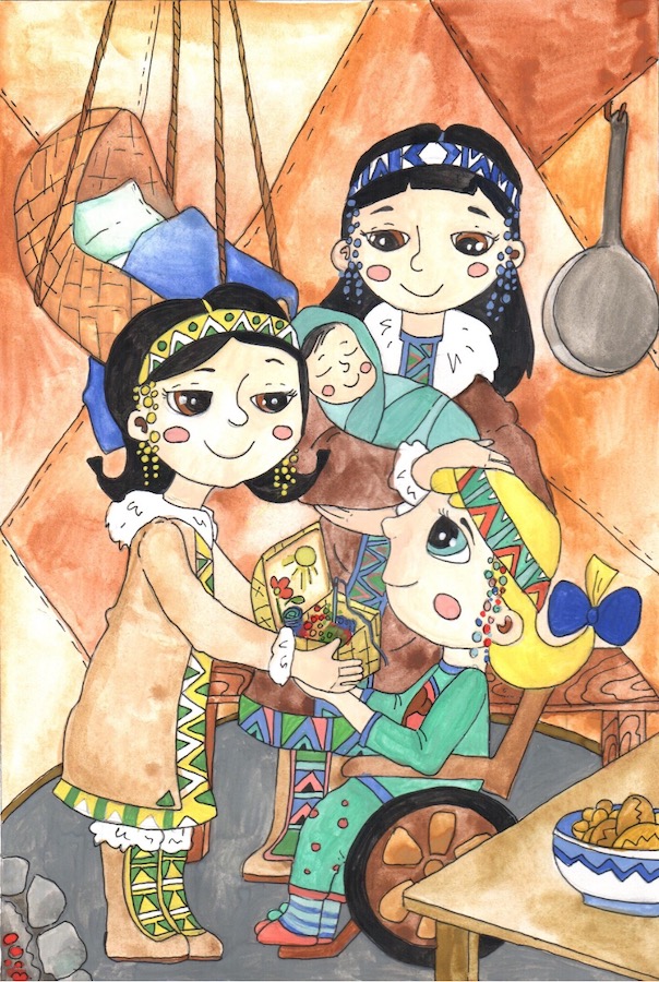 Пока девочки примеряли перед зеркалом яркое блестящее украшение и рассматривали богатства в шкатулке, мама Лены убаюкала маленького сыночка. Затем она быстро замесила тесто и испекла целую горку румяных лепёшек. Аромат от них такой, что даже слюнки у Светланки потекли.