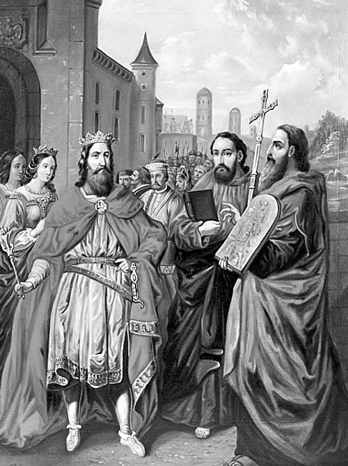 Князь Ростислав приветствует Кирилла и Мефодия, прибывающих в Велеград.