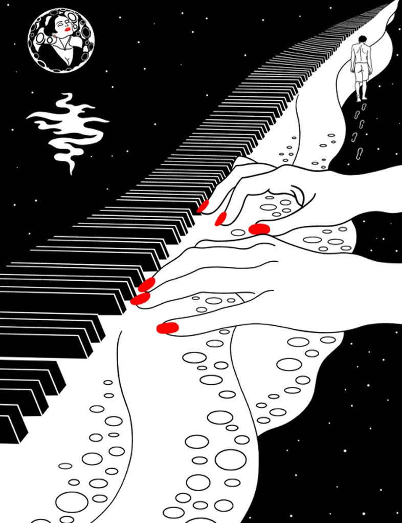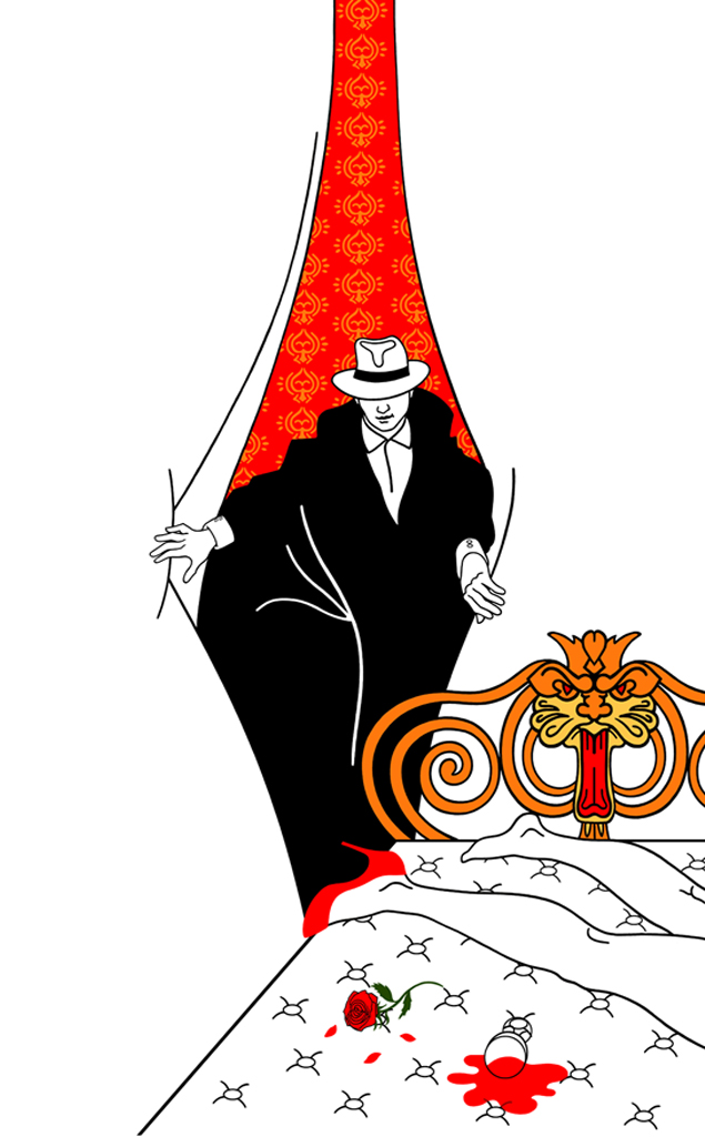 Алексей встал с кровати и медленными шагами подошёл к холсту. Некоторое время он стоял в задумчивости, как будто хотел разглядеть на белом полотне, освещённом луной какой-то фантазм. Наконец, он взял в руки уголь и стал наносить короткие, уверенные линии. Выполнив задуманное, он устало повалился на постель. Через пять минут он спал как ребёнок. На холсте появилась комната, задвинутая тяжёлыми портьерами, полки, уставленные предметами культа, и женщина, лежащая лицом вниз на широкой кровати с коваными перилами. На заднем плане виднелся затенённый образ, опускавший занавес, с окровавленным шилом в руке.