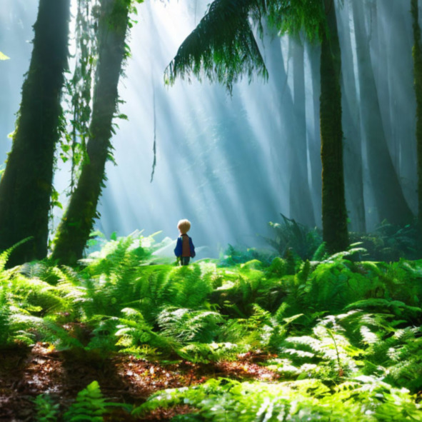 Вот это да! И правда как в сказке! Мальчик с открытым ртом оглядывался по сторонам. Деревья были такие толстые, что обхватить их не смогли бы и 5 человек вместе. А папоротники такие высокие, что мальчишка запросто бы заблудился в них, как в настоящем лесу.