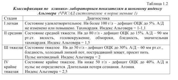 Классификация по объему кровопотери и клиническим признакам (Г. Я. Рябов):