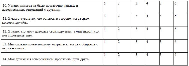 Данная шкала характеризует наличие достаточного количества доверительных отношений, наличие навыков установления и поддержания этих отношений; желание и способность быть гибким при взаимодействии со значимыми людьми, способность идти на компромиссы. Также здесь оценивается открытость к новым отношениям и способность сопереживать другим людям, которая способствует формированию крепких отношений.