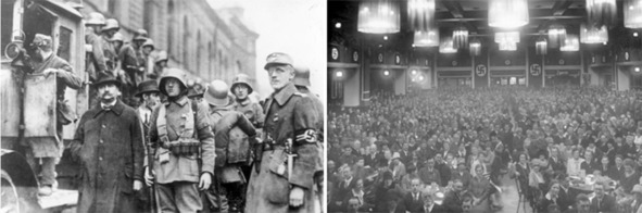 В ноябре 1923 г. национал-социалисты Гитлера и Рема предприняли попытку государственного переворота, вошедшую в историю под названием «пивной путч». Слева: один из моментов путча. Справа: пивная «Бюргербройкеллер», являвшаяся местом встреч нацистов и сочувствующих им лиц.