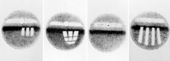 Оптограммы, зафиксированные Кюне в глазах подопытных животных – лягушек, кроликов и собак. Белые полосы – это различные световые фигуры, помещенные перед животными в момент умирания (умерщвлялись они очень быстро с использованием яда кураре). Надо поинмать, что изображения перевёрнуты, т.к. хрусталик действует подобно двояковыпуклой линзе. На втором слева изображении можно видеть окно лаборатории Кюне с расстекловкой на 9 стёкол.