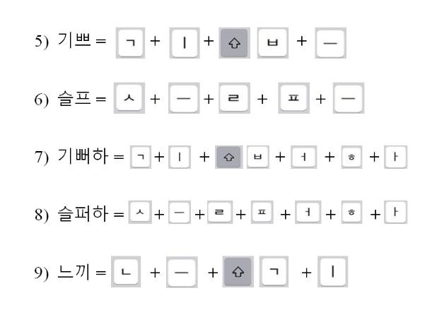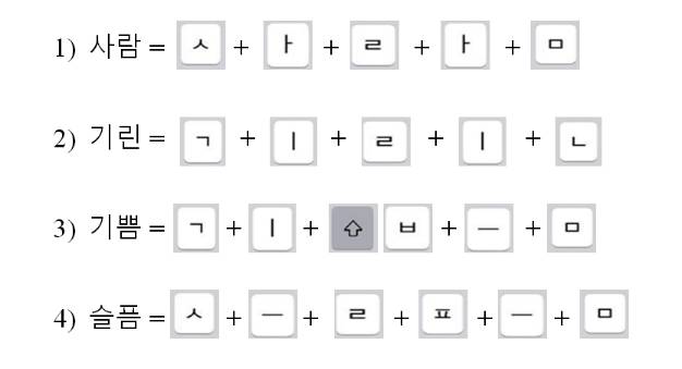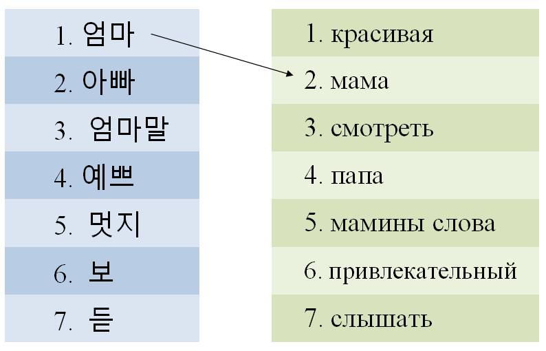 № 7. На телефоне или компьютере попробуйте напечатать следующие корни корейских слов: 엄마, 아빠, 엄마말, 예쁘, 멋지, 보, 듣.