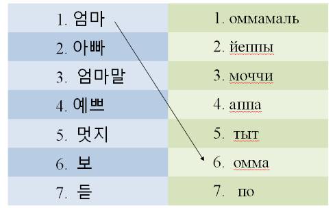 Омма (мама), аппа (папа), оммамаль (мамины слова), йеппы (красивая), моччи (привлекательный), по (смотреть), тыт (слышать).