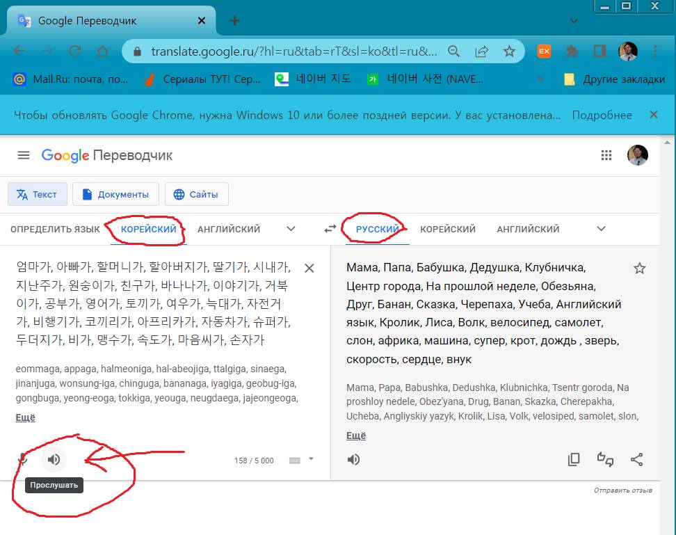 (Если вы пока не умеете читать слова, записанные при помощи корейской письменности «хангыль», то рекомендую вам копировать корейский текст, вставлять его в приложение Гугл Переводчик, чтобы послушать, как слова звучат на корейском языке.)
