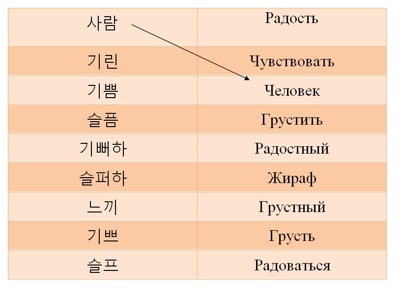 사람 (человек), 기린 (жираф), 기쁨 (радость), 슬픔 (грусть), 기쁘 (радостный), 슬프 (грустный), 기뻐하 (радоваться), 슬퍼하 (грустить), 느끼 (чувствовать).