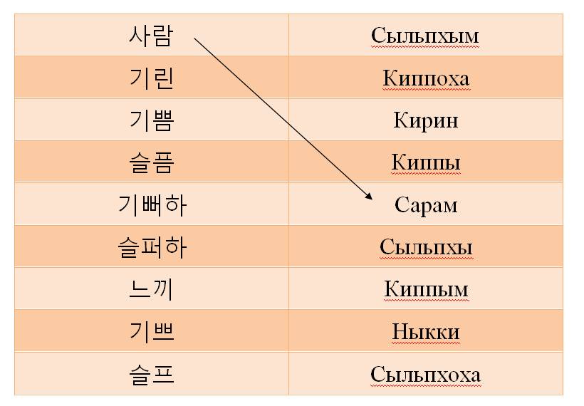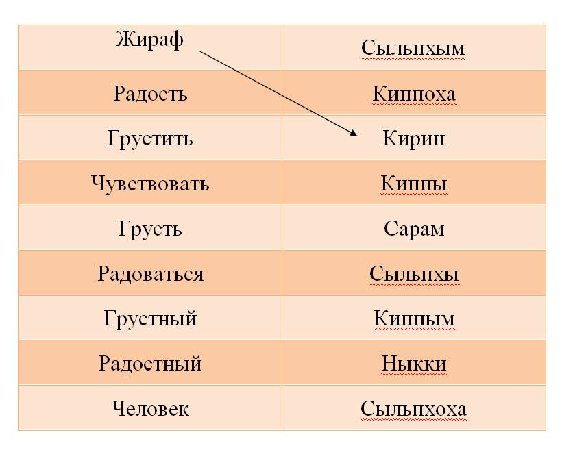 Сарам (человек), кирин (жираф), киппым (радость), сыльпхым (грусть), киппы (радостный), сыльпхы (грустный), киппоха (радоваться), сыльпхоха (грустить), ныкки (чувствовать).