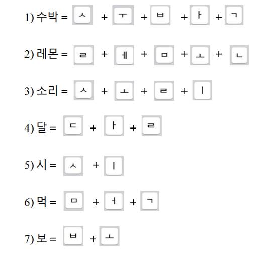 수박 (арбуз), 엄마 (мама), 레몬 (лимон), 아빠 (папа), 사람 (человек), 기린 (жираф), 기린소리 (звуки жирафа), 달 (сладкий), 시 (кислый), 먹 (есть), 듣 (слышать), 보 (видеть).