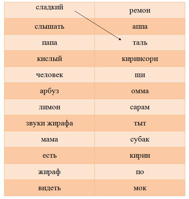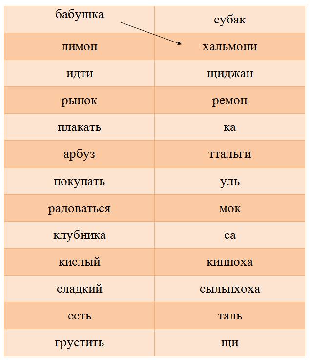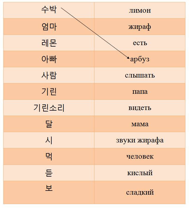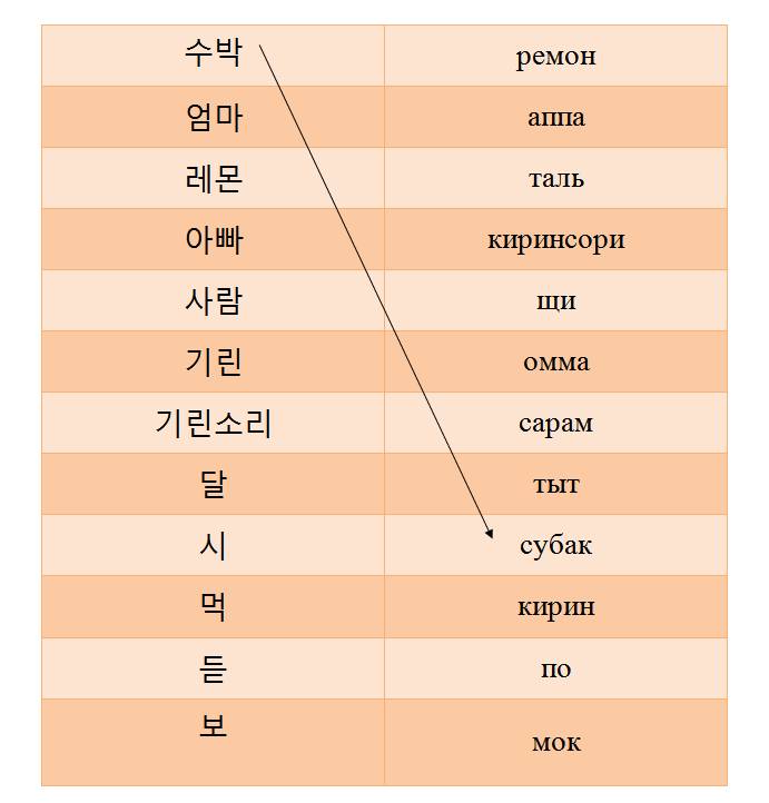 Субак (арбуз), омма (мама), ремон (лимон), аппа (папа), сарам (человек), кирин (жираф), киринсори (звуки жирафа), таль (сладкий), щи (кислый), мок (есть), тыт (слышать), по (видеть).