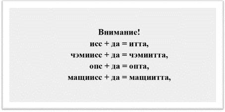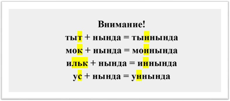 Окончание НЫНДА означает конец повествовательного предложения, напечатанного В КНИГЕ, ГАЗЕТЕ ИЛИ ЖУРНАЛЕ. НЫНДА присоединяется к корню слова, которое означает действие (слышать, есть). НЫНДА присоединяется к корню, который заканчивается на согласный звук ("н", "к", "т" и т.д.). НЫНДА означает настоящее время.