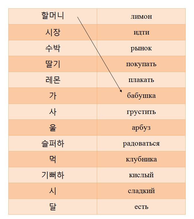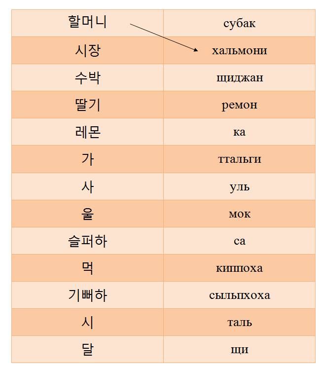 Хальмони (бабушка), щиджан (рынок), субак (арбуз), ттальги (клубника), аппа (папа), омма (мама), сарам (человек), кирин (жираф), ремон (лимон), ка (идти), са (покупать), сыльпхоха (грустить), мок (есть), киппоха (радоваться), уль (плакать), таль (сладкий), щи (кислый).