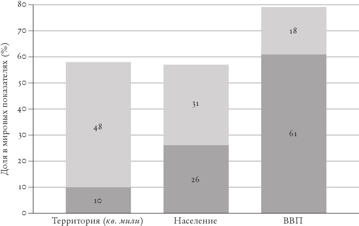 Некоторые утверждают, будто цивилизации в некотором смысле равны и что Запад не может претендовать на превосходство, скажем, над Восточной Евразией12. Но очевидно, что такой релятивизм абсурден. Ни одна цивилизация прошлого не достигала такого уровня, как западная13. В 1500 году будущие европейские империи занимали около 10% поверхности земной суши и охватывали около 16% населения планеты. К 1913 году 11 западных империй* контролировали почти 3/5 суши и населения и около 3/4 (79%) мирового производства14.