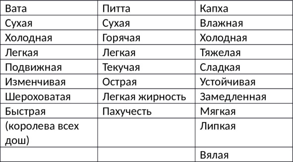 Вата доша образована двумя первоэлементами ЭФИР и ВОЗДУХ. Это определяет ее основные свойства: сухая, холодная, подвижная.