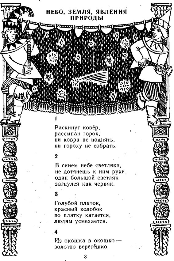 5Без рук, без ног по полю рыщет,поёт да свищет,деревья ломает,к земле траву приклоняет.6Заря-заряница по полю ходила,ключи обронила,месяц видел, солнце вскрало,а земля схоронила.7Сильнее солнца,слабее ветра,ног нет, а идёт,глаз нет, а плачет.8Летит огневая стрела,никто её не поймает:ни царь, ни царица,ни красна девица.9Крякнула уткана весь свет чутко.10Красное коромыслочерез реку повисло.11Бело покрывалона земле лежало,лето пришло,оно всё сошло.12Меня частенько просят, ждут,а только покажусь,то прятаться начнут.ОТГАДКИ: I. Звёзды на небе. 2. Звёзды, месяц. 3. Небо и солнце. 4. Лучи солнца, свет. 5. Ветер. 6. Роса. 7. Туча. 8. Молния. 9. Гром. 10. Радуга. 11. Снег. 12. Дождь.