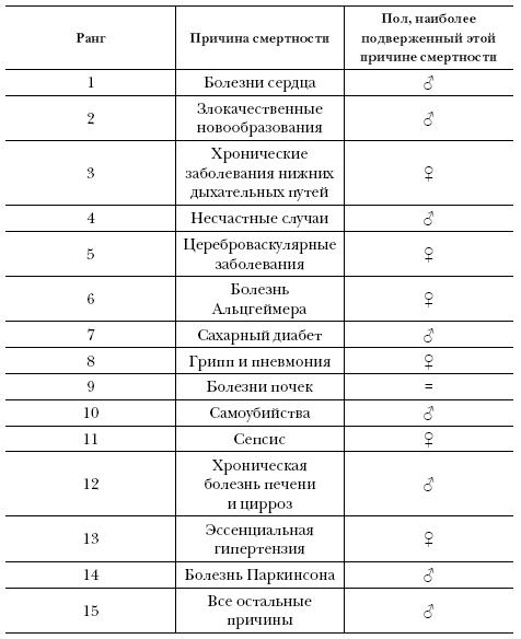 В развитых странах структура причин смертности у мужчин и женщин различается (см. таблицу). На лидирующих позициях у мужчин находится смертность от сердечно-сосудистых и онкологических заболеваний, болезни Паркинсона, несчастных случаев, сахарного диабета, болезней печени и суицидов. Женщины чаще умирают от болезней дыхательных путей, цереброваскулярных заболеваний, последствий остеопороза и болезни Альцгеймера.