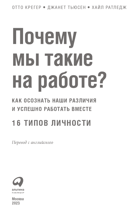 Почему мы такие на работе? Как осознать наши различия и успешно работать вместе. 16 типов личности / Отто Крегер, Джанет Тьюсен, Хайл Ратледж; Пер. с англ. – М.: Альпина Паблишер, 2023.