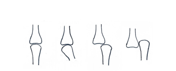 Рис.12. Слева направо: сустав в норме; подвывих; подвывих; полный вывих