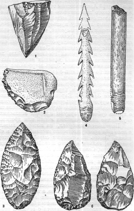 Prodotti paleolitici superiori dalla Siberia: 1-nucleus di tipo prismatico; 2-raschiato da ciottoli piatti; 3-punta a forma di alloro; 4-arpione osseo; 5 – punta di rivestimento; 6-punta appuntita. 1, 2 e 6 – Dalla Transbaikalia; 3, 4 e 5 – dalla montagna Verkholenskaya, vicino a Irkutsk. Storia del Mondo, vol. I, caporedattore E. M. Zhukov, M., Casa Editrice Statale di letteratura politica, 1956, p. 79