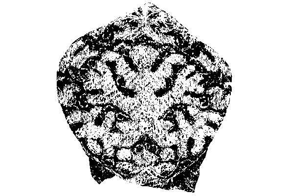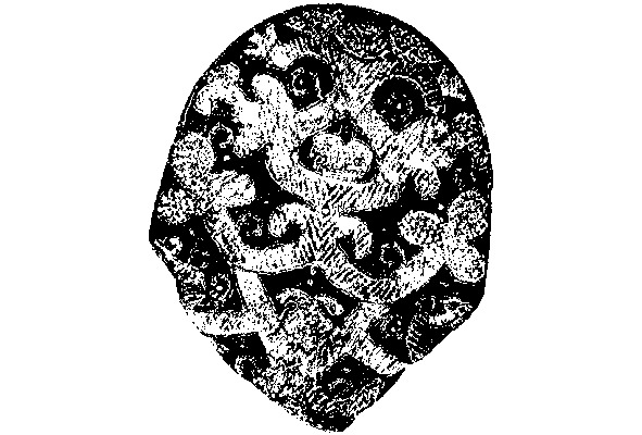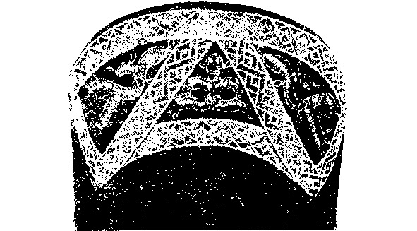 Эти повойники отличает от головных уборов «молодух» обилие серебряного, а не золотого шитья (золото здесь опущено в фон). Даже при беглом взгляде на такой повойник «нашлепку» отчетливо видна бородатая, круглая, оскалившая зубы в недоброй улыбке личина или, говоря по—простому, «рожа» (илл. 5, 6). Но образ этот удивительно полисемантичен, и если внимательно всмотреться в рисунок серебряной вышивки, то перед нами предстанет губастая, носатая и рогатая голова быка. Невольно вспоминаются строки из «Вакханок» Еврипида, слова прозревшего Пенфея, обращенные к Дионису: