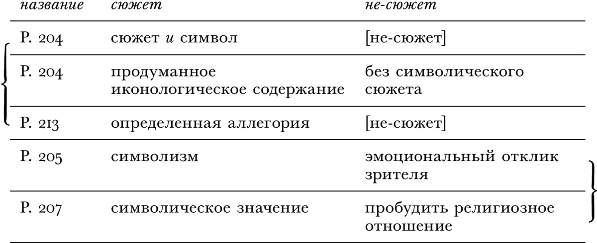Из сказанного следует, что противопоставление сюжета и не-сюжета – это слишком радикальный жест, поскольку ни один «историк стиля» не будет отрицать, что изображение Рождества Христова есть Рождество Христово, а ни один приверженец иконологии не будет спорить с тем, что миф может и не быть аллегорией. Вероятно, излишне упрощая иконологию, Гилберт отождествляет ее с изучением символов и аллегорий, исходя из того, что ее сторонники преимущественно анализируют картины, предлагающие наибольшее разнообразие символов. Из противопоставления «иконологов» и «историков стиля», которых лишь по ошибке можно называть представителями двух разных школ, автор фактически выводит противопоставление стиля и значения. Тем не менее в своих, разумеется, ложных, рассуждениях Гилберт, возможно, невольно, приходит к важнейшей мысли. Если, с одной стороны, существуют исследователи, которые, не отрицая сюжета, на практике изучают только стиль, а с другой – исследователи, которые, не стремясь любой ценой обнаружить символы и аллегории, на практике изучают только значение, то разделение формы и содержания само по себе превратилось в противопоставление и привело к драматичному разрыву не только в личности художника, но также и внутри каждого отдельного «произведения искусства».