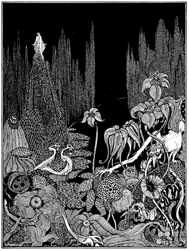 И человек сел на скалу и склонил голову на руку и смотрел на запустение. Он смотрел на низкий непокойный кустарник, и на высокие первобытные деревья, и на полные гула небеса, и на багровую луну. И я затаился в сени водяных лилий и следил за человеком. И человек дрожал в уединении; но убывала ночь, а он сидел на утесе.