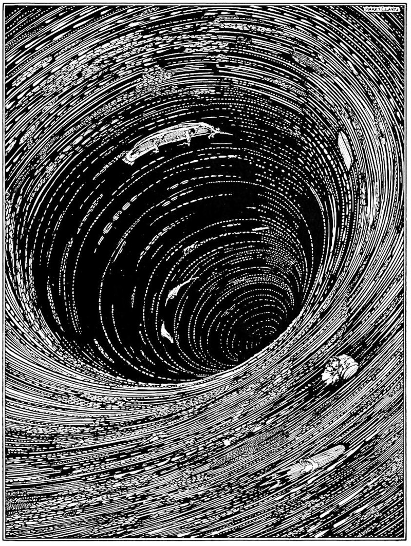 Никогда не забуду я ощущения благоговейного трепета, ужаса и восторга, охвативших меня. Шхуна, казалось, повисла, задержанная какой-то волшебной силой, на половине своего пути в бездну, на внутренней поверхности огромной круглой воронки невероятной глубины; ее совершенно гладкие стены можно было бы принять за черное дерево, если бы они не вращались с головокружительной быстротой и не отбрасывали от себя мерцающее, призрачное сияние лунных лучей, которые золотым потоком струились вдоль черных склонов, проникая далеко вглубь, в самые недра пропасти.