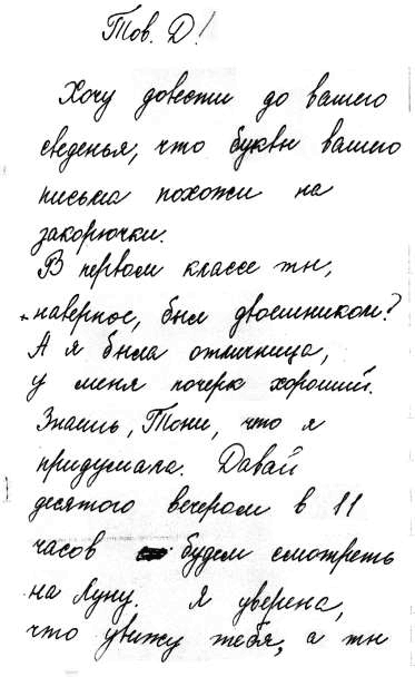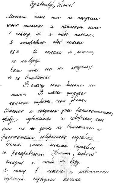 – А вот это лишнее. Да-а… Выскочила такая вспоминалка… Получай отоварку! Ты зачем прислал мне на школу одно письмо? На будущее знай. В школу мне больше не пиши. Цензура! Распечатали… Говорят, совершенно случайно. Мои родаки́[20]… Дома мои письма случайно не раскрывают. Писать сто раз люблю в тот день я тебе не стала. Я пишу на уроках, и любопытные без конца пихают носы в мою писанину…