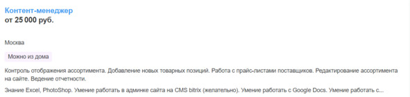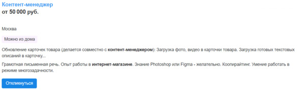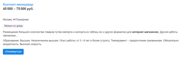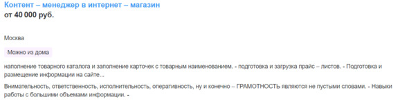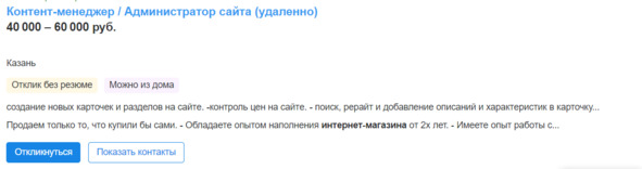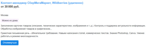 Как я писала выше, многие и сами не понимают, кого ищут. И требования предъявляют разные. Например, одним нужны просто специалисты, которые будут добавлять контент и описание к товару, а у других в обязанности входит умение разбираться во всем движении товара. Соответственно, и зарплаты будут разные. Размер оплаты зависит от требований заказчика и компании, в которую вы трудоустроитесь.