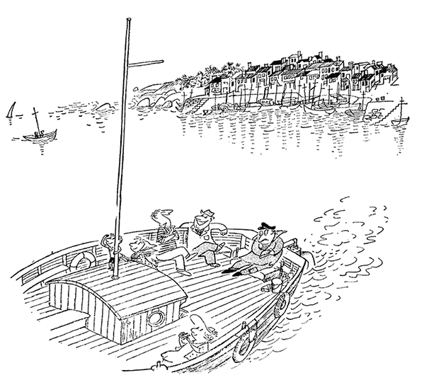 Хозяин корабля не стал поднимать паруса, как его просил мсье Лантерно, потому что парусов на нашем корабле не было. Зато был мотор, который урчал «вр-вр-вр», и от него пахло, как от автобуса, который ездит по улице мимо нашего дома. Мы отплыли от пристани, вокруг были маленькие волны, кораблик развернулся, и всё шло очень здорово.