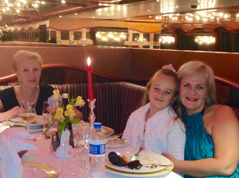 Конечно к ужину оделись красиво, навели марафет и сделали причёски. Я в синем, Анна в зеленом, Нюшенька в белом.